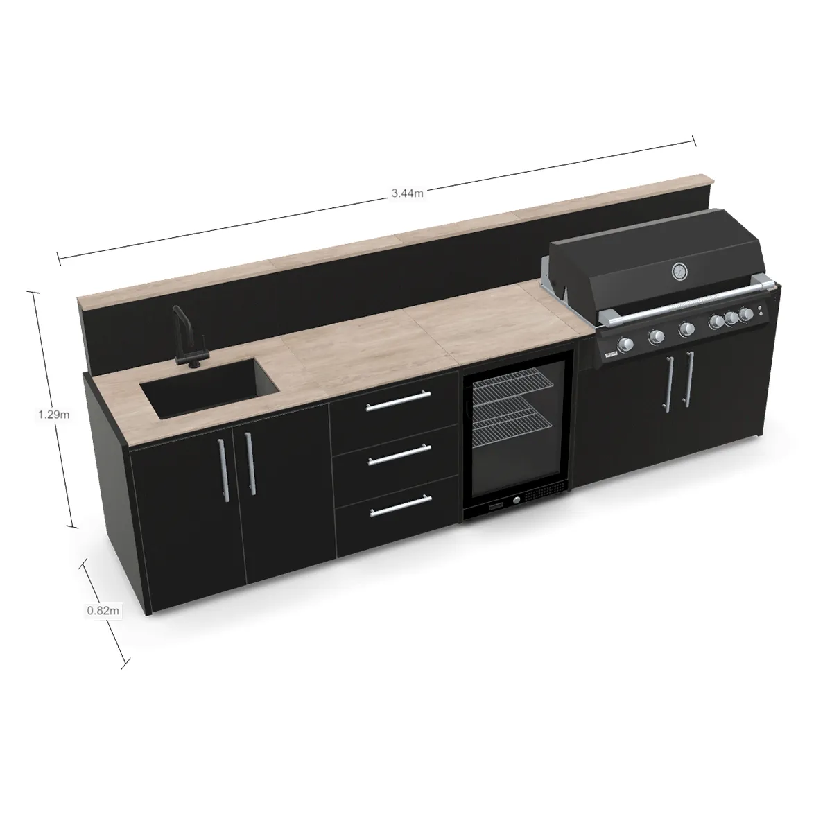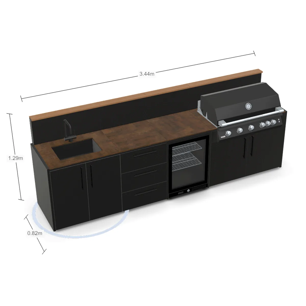 Gemaakt van gepoedercoat zwart roestvrij staal in kleur antraciet grijs RAL 7021 met Summer Dala* Neolith werkblad. Achterwand met Summer Dala* Neolith topwerkblad voor extra bescherming en bergruimte. Perfect voor intensief gebruik in alle weersomstandigheden.