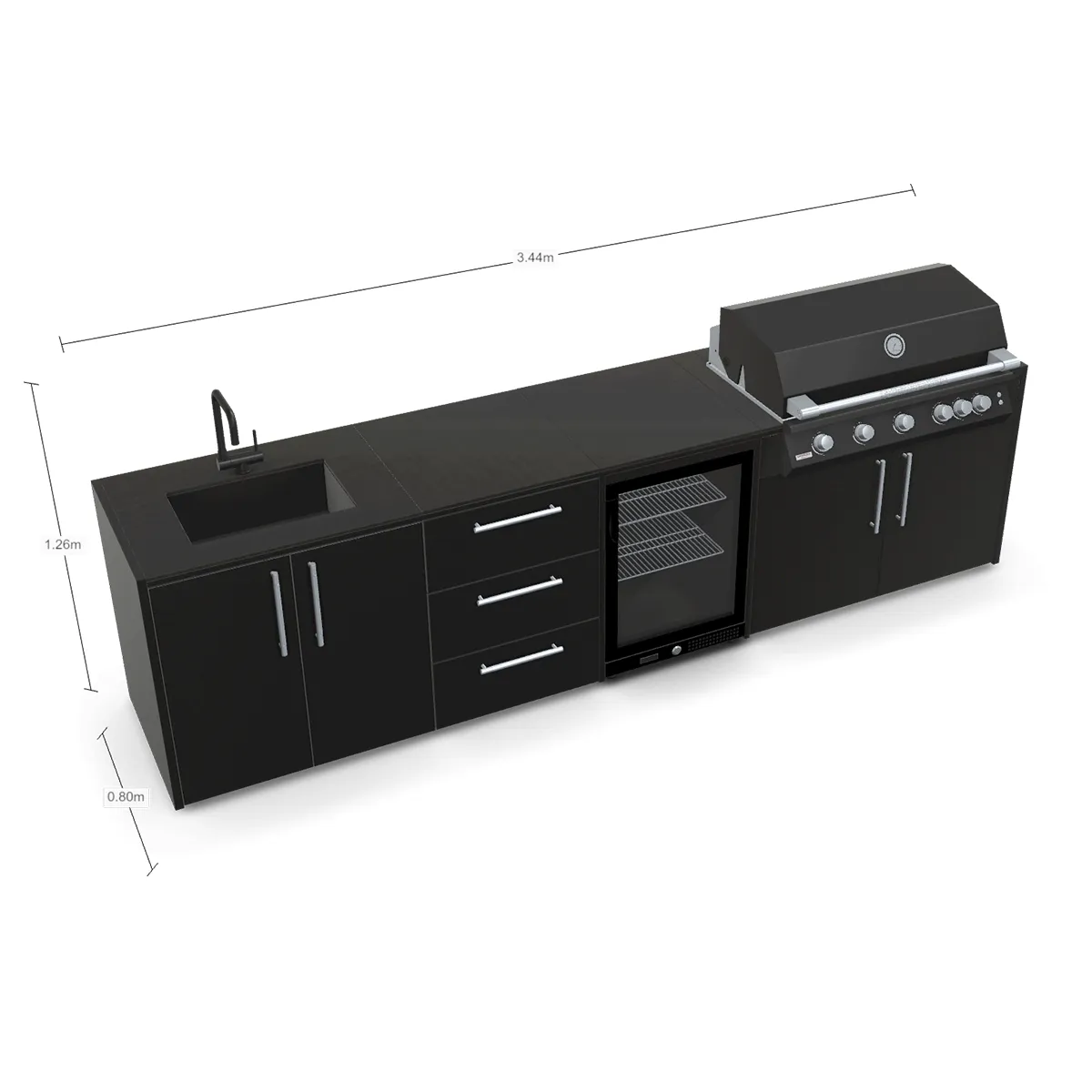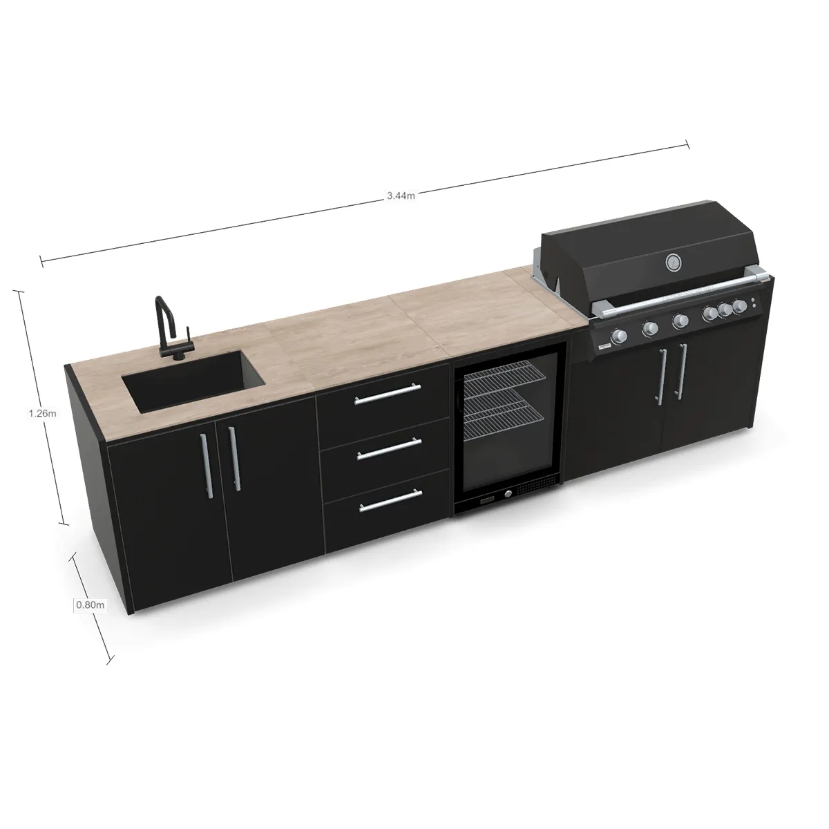 • Afmetingen: 344 x 126 x 80 cm (BxHxD) – complete RVS buitenkeuken