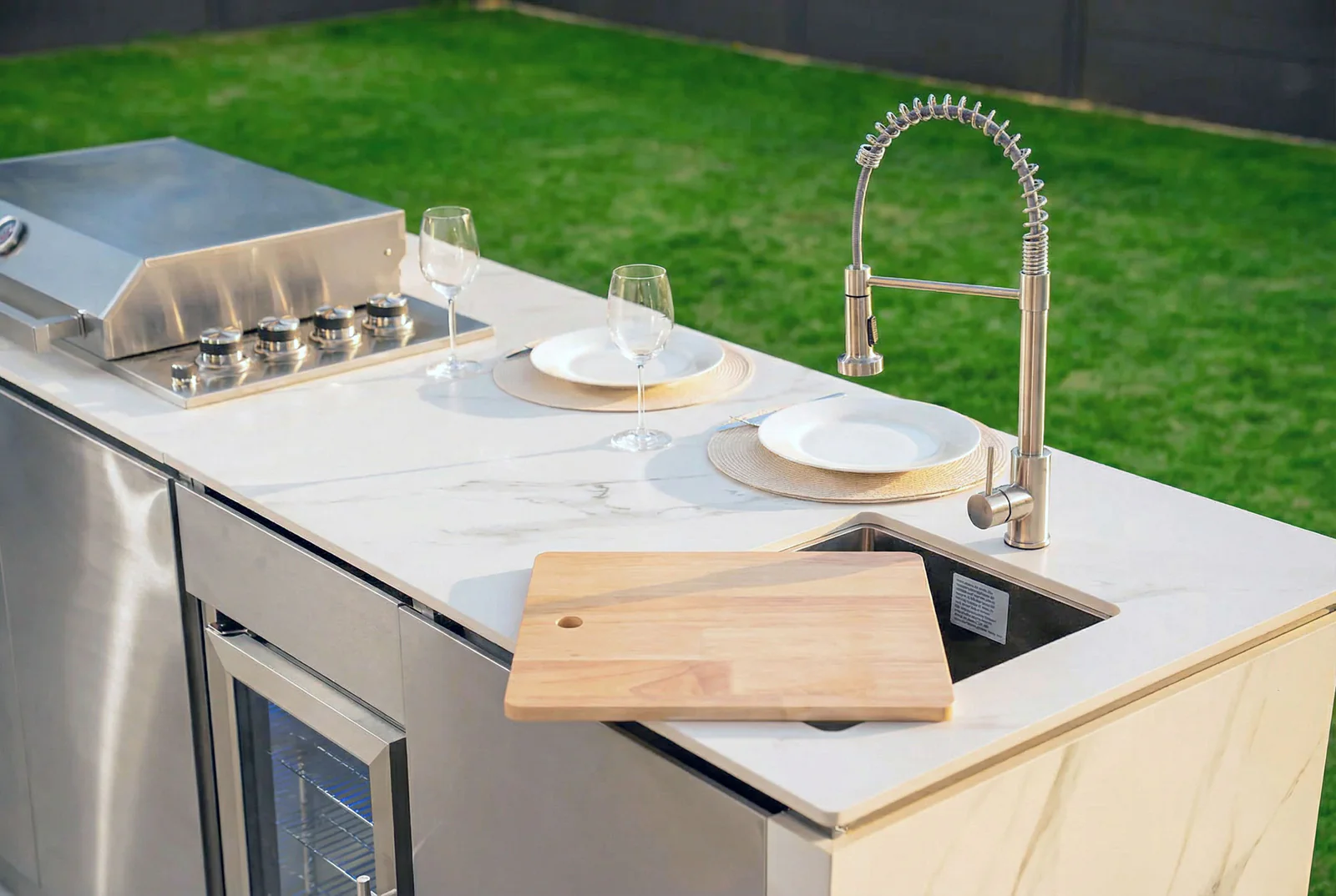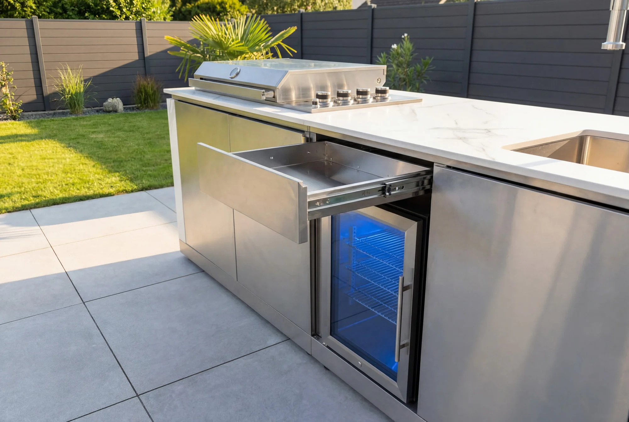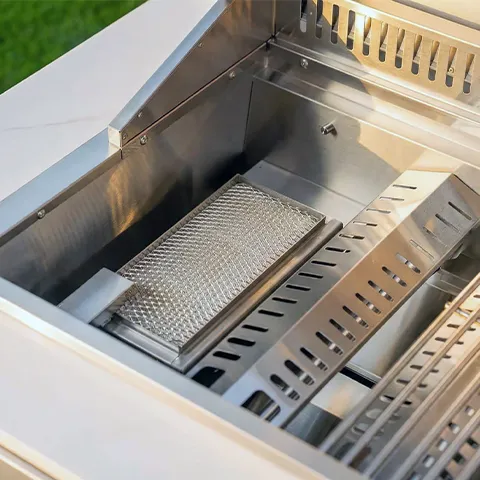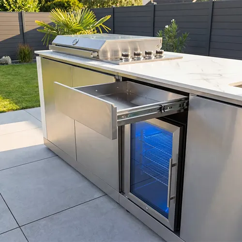 Perfect voor grote barbecue-avonden waarop het draait om het overtreffen van alle verwachtingen en volledig ontspannen blijven. De buitenkeuken is weerbestendig, duurzaam en gemakkelijk schoon te maken. Het elegante ontwerp maakt ze tot een stijlvol hoogtepunt in elke tuin.