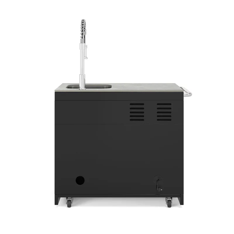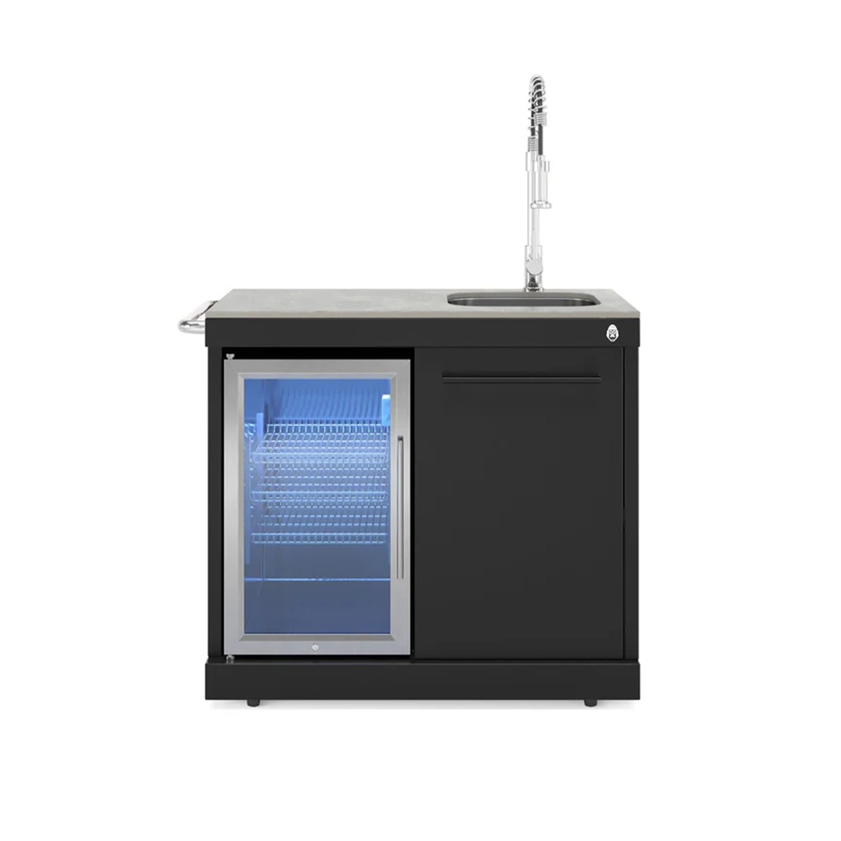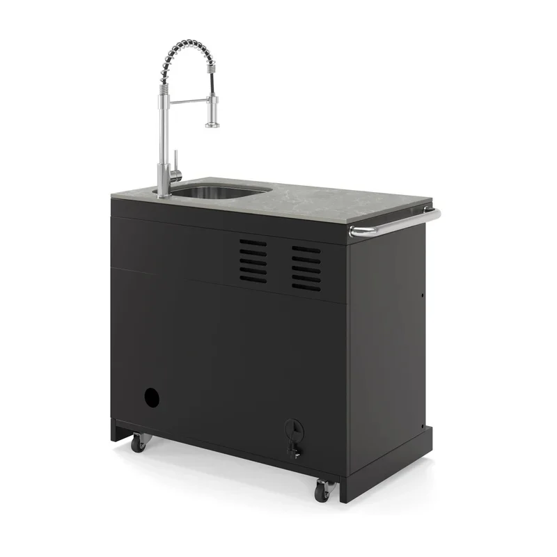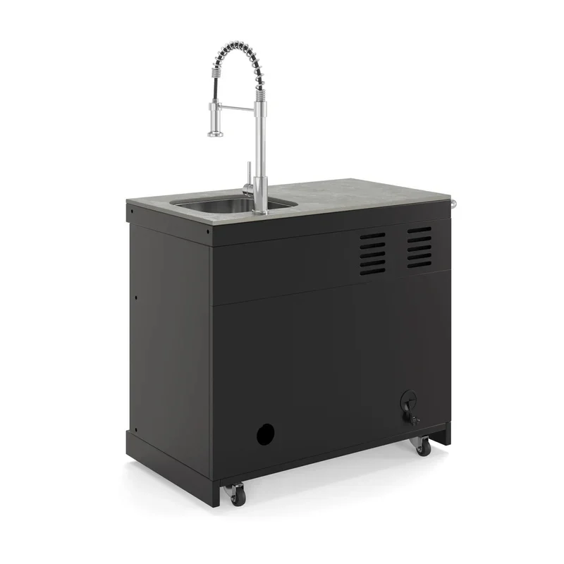 De Goriller COOL CLEAN EMPIRE Black Module Buitenkeuken combineert een koelkast van 63 liter met een roestvrij stalen spoelbak en kraan (warm en koud water) voor maximale functionaliteit.