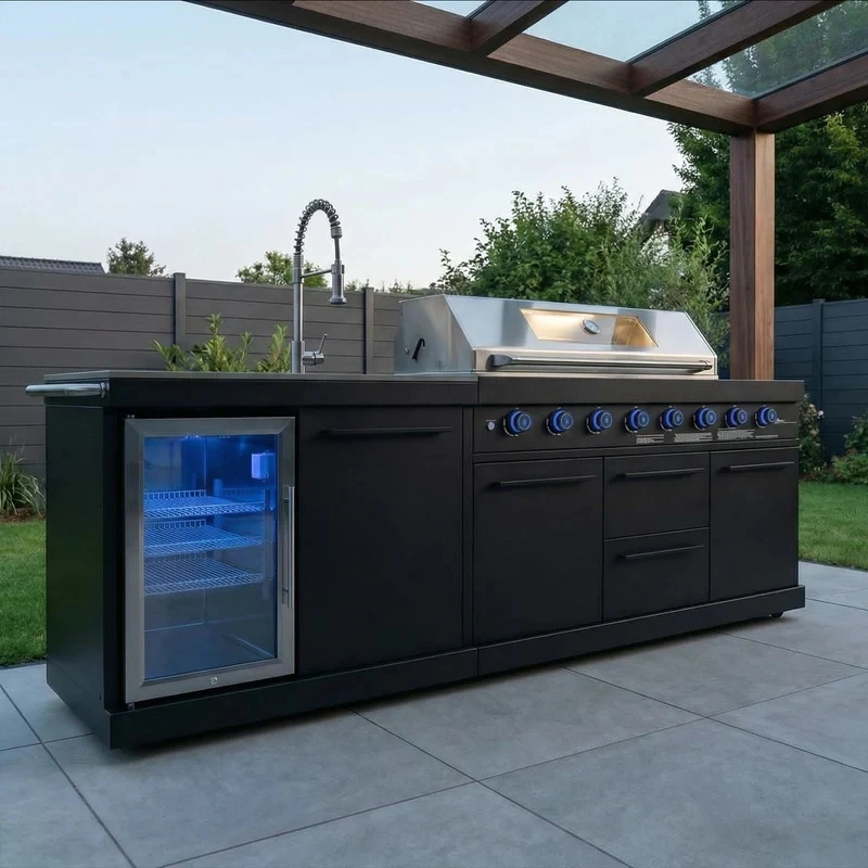 - Het materiaal van de buitenkeuken is gemaakt van stevig en duurzaam aluminium en roestvrij staal, dat bij goed onderhoud en bescherming de buitenkeuken corrosie- en weersbestendig houdt.