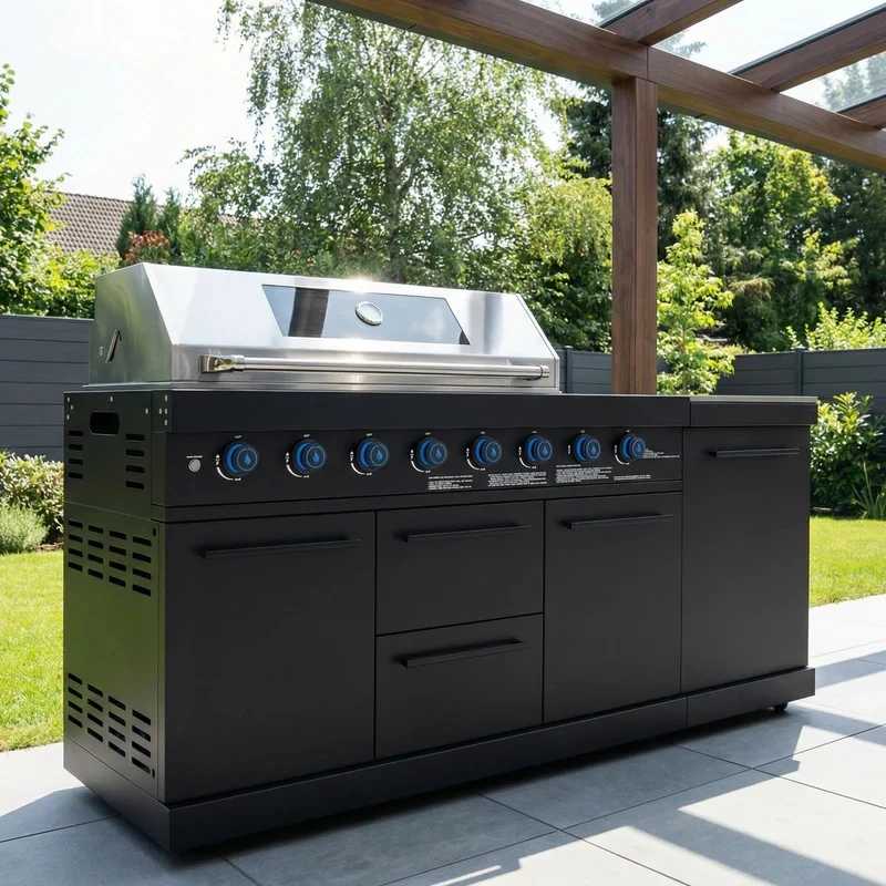 - Deze buitenkeuken heeft een ruime gasbarbecue met hoogwaardige roestvrij 8 mm stalen grillroosters en een stabiele behuizing voor langdurige prestaties.